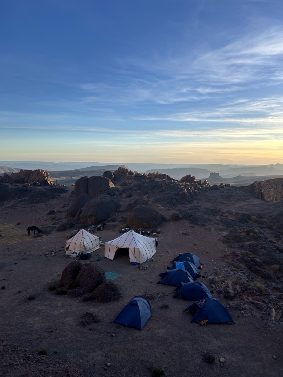 Mules loaded at dawn. Cross vast volcanic plateau to Iferd (2,250m) where nomad camps appear like mirages.